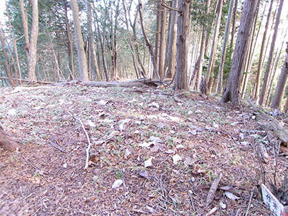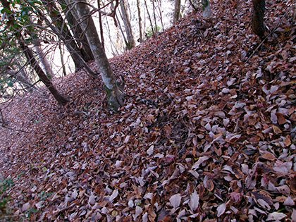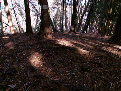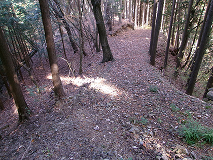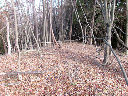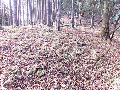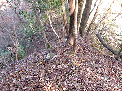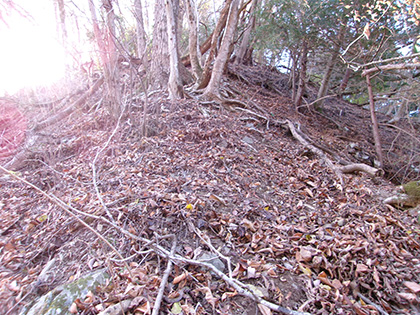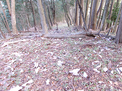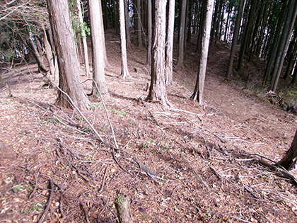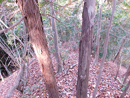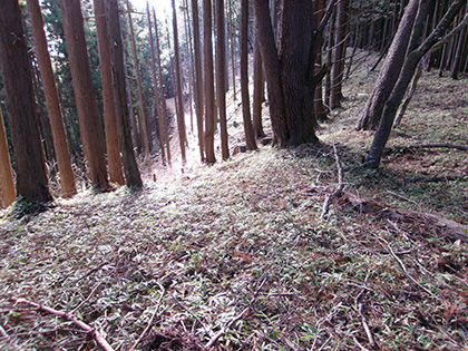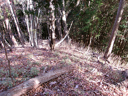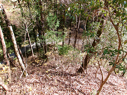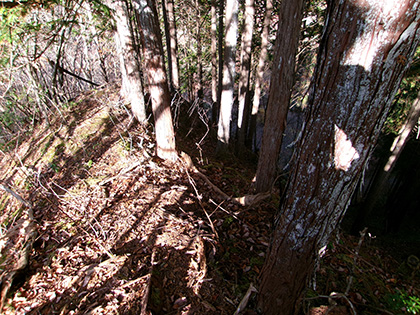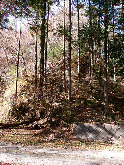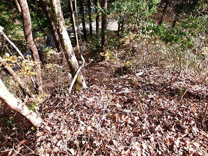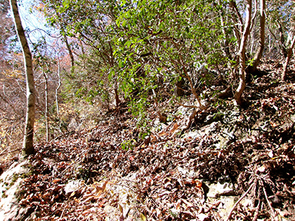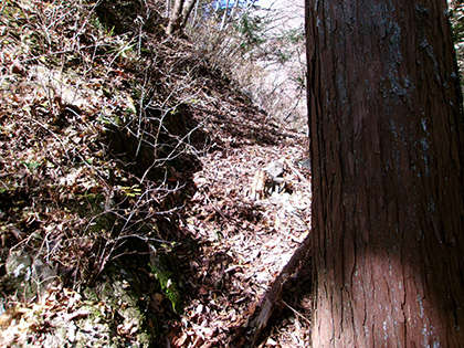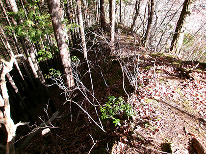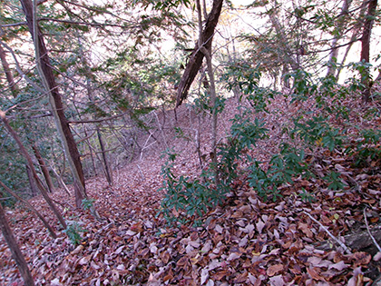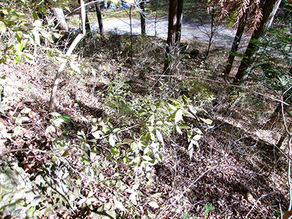 尾根と林道の段差が激しかった場所。640m圏です。写真右のほうに移動して林道に降りました。ここが林道と接した最後でした。