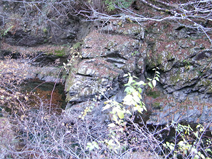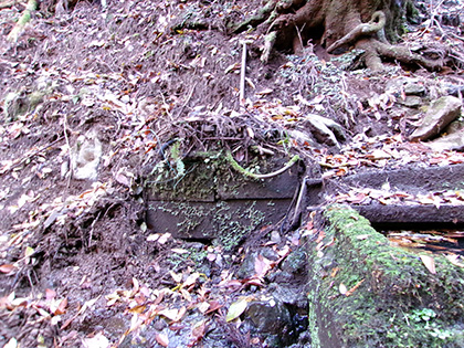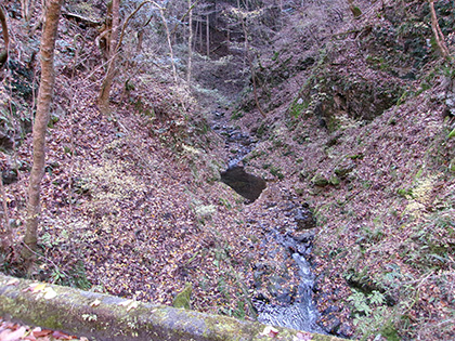 湯船の左上、石碑が建っていた場所です。流されたのか、周辺を探してみましたが見つかりませんでした。軍手をはずして湯船に貯まった水に手をつけたら「ちべた!」。残念。温かったら素っ裸になって入ってやろうと思っていたんですが、これは無理。水面はかすかに波打っています。風のせいなのか水が湧いているのかわかりません。においをかいでも無臭です。「湯場」の由来に立てたことで満足です。引き返します。