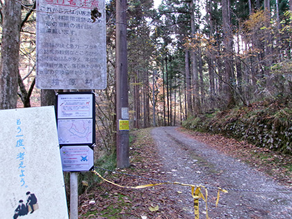 奥から歩いてきて小坂志林道の起点です。