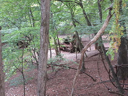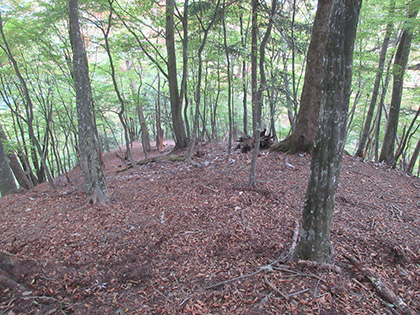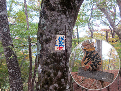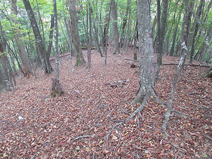尾根上から「金袋山のミズナラ」が見えました。かつて幹周7.51m、樹高20mの威容を誇った巨樹ですが、数年前に枯れて折れ、倒れてしまいました。なぜ「人形山のミズナラ」ではないのか、奥多摩100不思議のひとつになっているのかどうかは不明です。