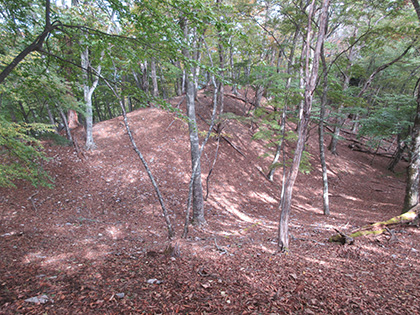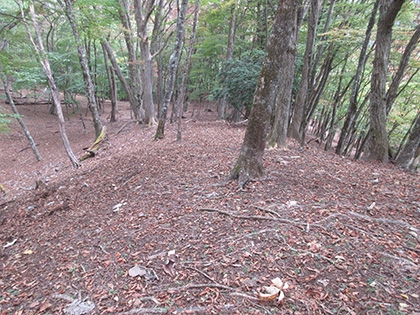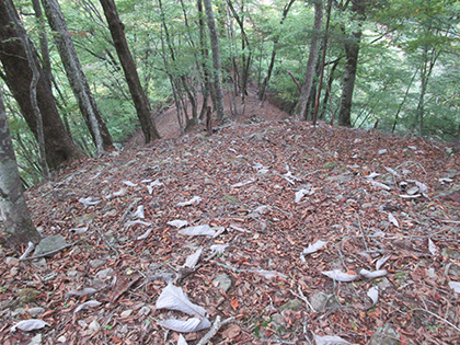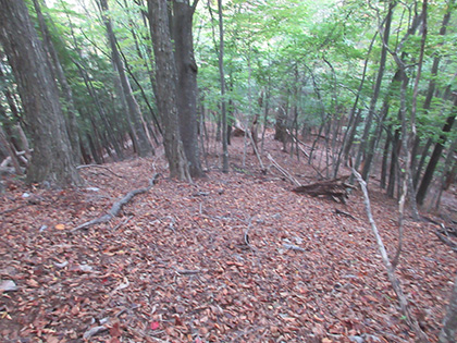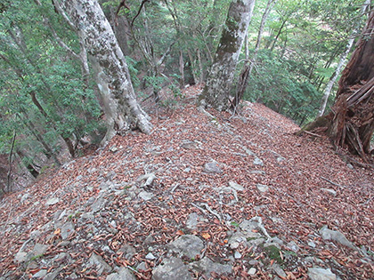 850m圏の鞍部で尾根を横切る小川谷上段歩道にぶつかりました。