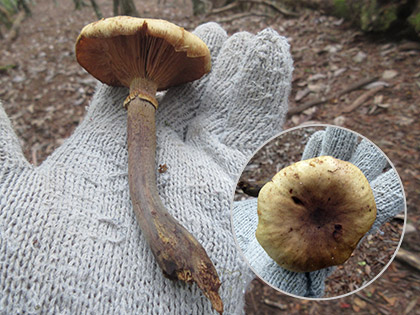 若そうなのを何本か採取(かつて食べた記録はマスタケと同じページです)。傘の中央に黒い斑点がある。傘の縁に放射状の線がある。つばがある。つばから下は褐色。柄を折るとポキっと音がする。など、ナラタケの特徴にバッチリです。