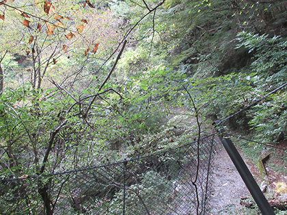右へ進んですぐ、通せん坊で下段歩道をはなれて左へ下ります。