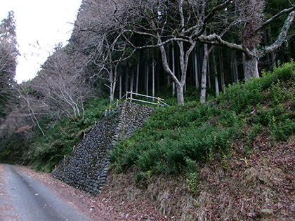 取付点を探してマンナリ沢左岸の林道万成線につづく道を登っていくと、新しそうな石積の擁壁と擁壁につくられた階段がありました。