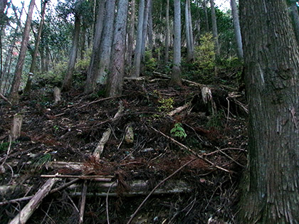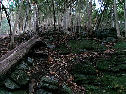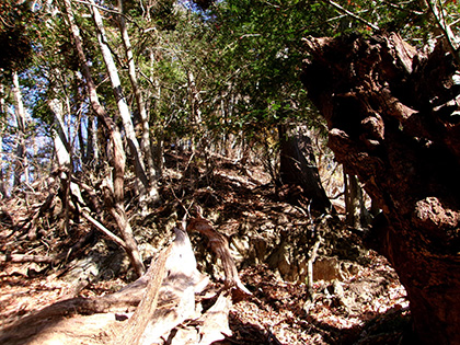 マンナリ沢左岸尾根は笹藪にあいた穴から取付きました。獣気分で穴を抜けると植林に囲まれたかなりキツい勾配の岩崖です。予想外の展開でした。とまどったんですが命をとられるほどのデンジャラスさではなく、けれども落ちたらかなり痛いめにあう、そんな岩崖がつづきました。
