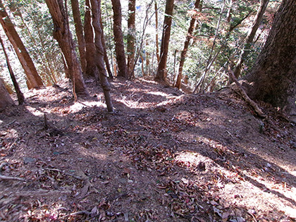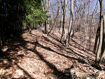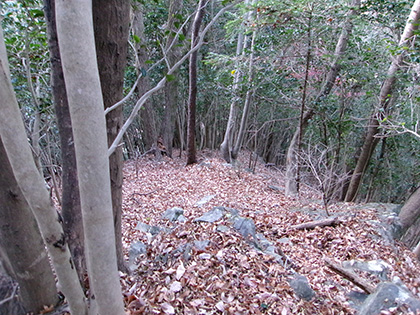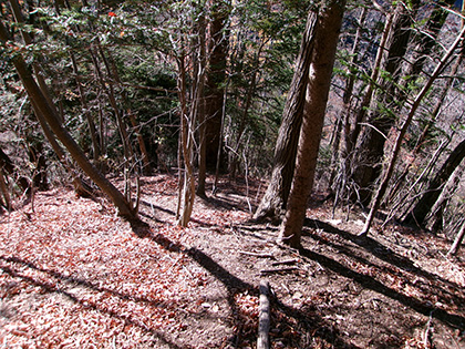 抜けました。現れたのはキツい急登です。獣の踏み跡をテキトーにたどって勾配をいなしながら登ります。