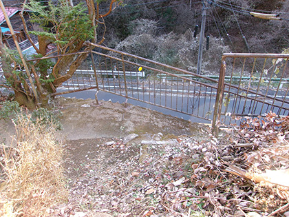 踏み跡を捉え、たどると原っぱから一段下に鉄の手すりが見えました。写真中央上の暗がりです。