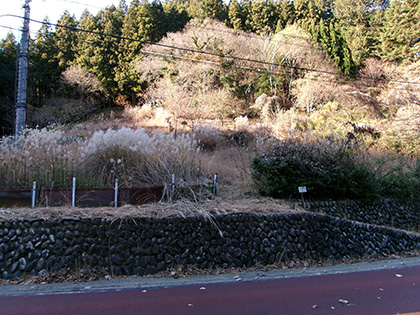 垣根の向こうはススキの原っぱ。どう進んでいいのかわからなくなって右手の植林の中へ逃げ込みます。