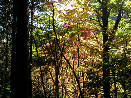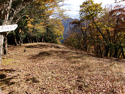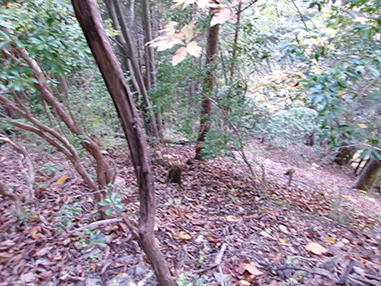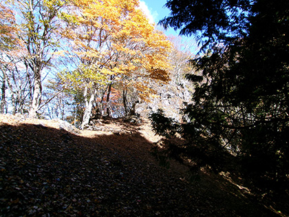 狩倉山南尾根は上部をほんの少し石尾根と重複した後、右(南東)へかなりキツい勾配で下っています。右手の小中沢側に激しく切れ落ちていたりもします。小中沢側は雑木が多く、西日が黄色い葉っぱを照らしてとてもきれいでした。