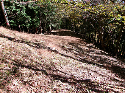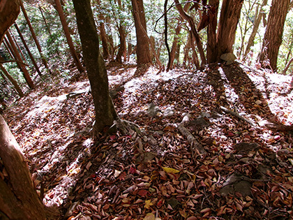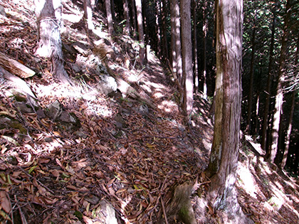 下ります。先が見えません。急降下がはじまりそう。右手が雑木になりました。傾きはじめた西日が尾根に木々の影を落とします。