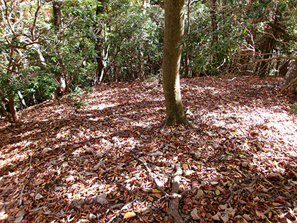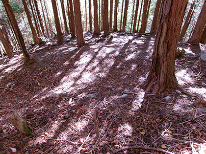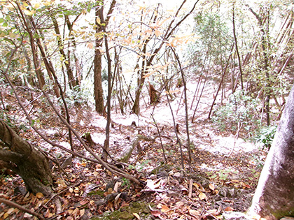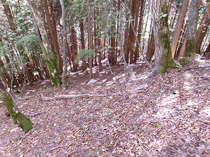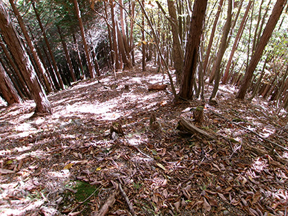 左手の植林帯へじんわりじんわりトラバース(山腹水平移動)。錯綜している薄い踏み跡をテキトーにたどります。