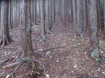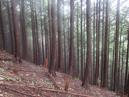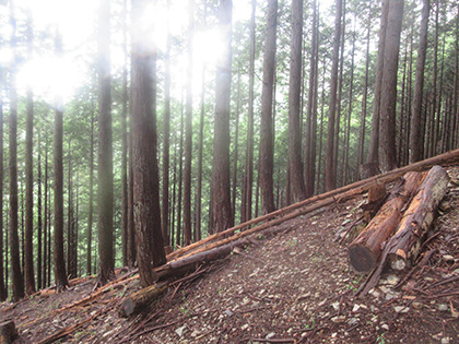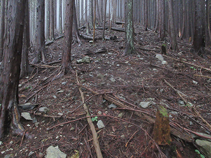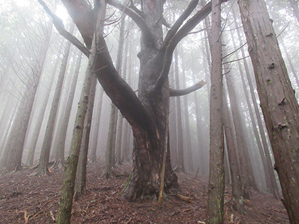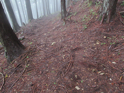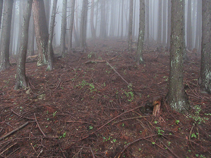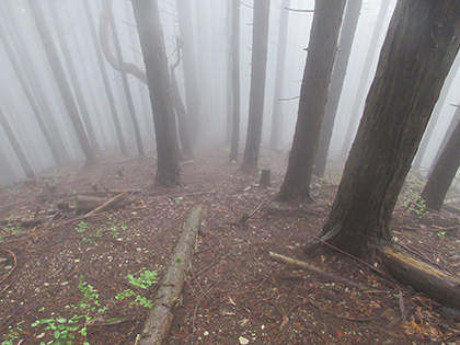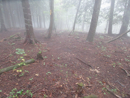 長野川上流二俣中間尾根は前半は岩混じりの急登で急登を忘れがちだったんですが、後半は植林に囲まれた一途な急登になりました。雲の中を登って登って笹尾根の稜線に立ちました。