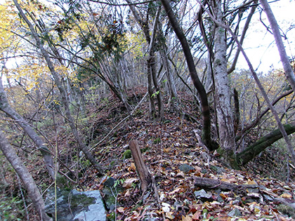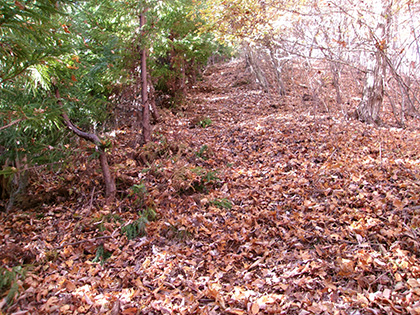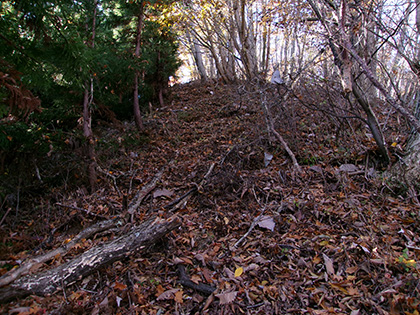 見上げると草木を被った岩崖です。杖を背中とザックの間に挟み、よじ登ります。