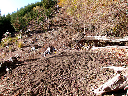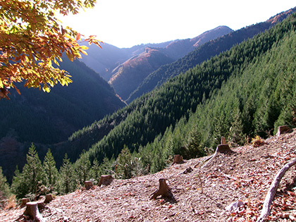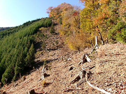 急登に思いやられました。ただ、左からビシッと日を受けながら伐採地跡のへりを登り、どか〜んとした眺望に見とれたりもしたのでした。