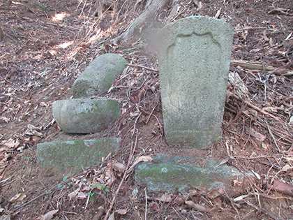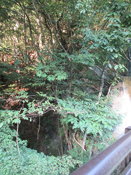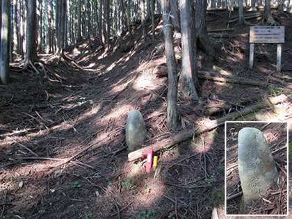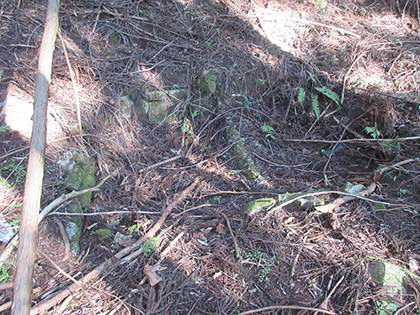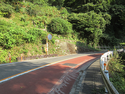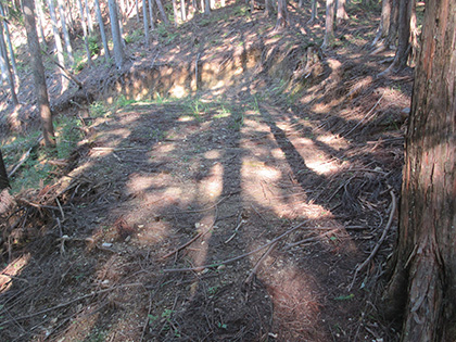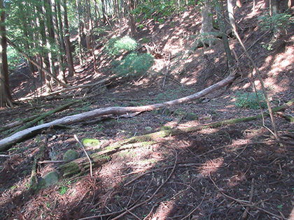 大羽根山東尾根の取付は森沢という沢と檜原街道の交点を想定していたけれど、現場に立ってみると垂直に切り立った崖でした。取付くのは無理。檜原街道沿いに尾根を回り込んでいくと大羽根山東尾根の稜線に向かう坂道が擁壁にビシッと刻まれているではありませんか。と、まあ、実は、ここまでは前回に檜原街道を歩いたときに調べはついていました。