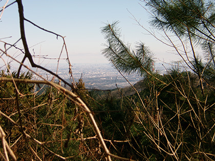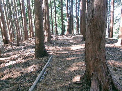 都心方向がちらりと眺められます。決定先延ばし作戦に白黒つける時です。臼杵山を経てグミ尾根から下る伝名沢左岸尾根は諦め、決定先延ばし作戦の会議で気になっていた市道山から北東にのびる破線を下ることにしました。破線は千ヶ沢の源頭から千ヶ沢を忠実にたどり、千ヶ沢林道までつづいています。このルートならいくら時間がかかっても日没前に林道に出られるはずです。