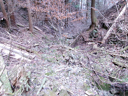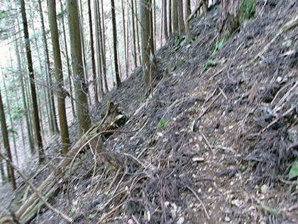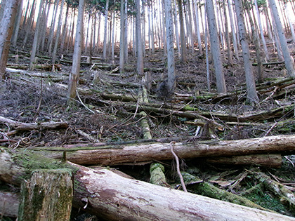 市道山から北東にのびる地形図の破線に道はございません。廃道というか消道というか、冒険チックな破線もどきを倒木や伐採木がぐしゃぐしゃと折り重なる谷筋をひたすら下り、障害物がなくなると谷底や右岸や左岸をテキトーに下っていきます。