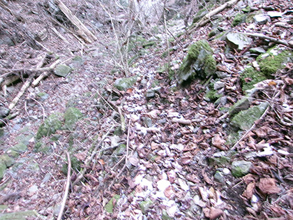 ガレ場の向こうに踏み跡がつづいているようないないような。けれども千ヶ沢からはなれると千ヶ沢林道に着地できなくなります。