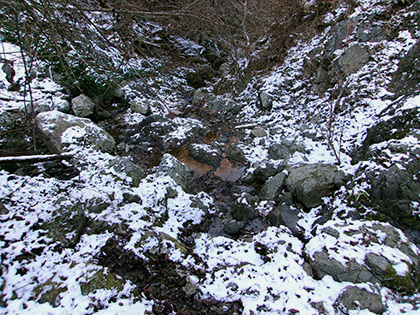 両岸から突き出た岩壁の向こうは見渡せません。踏み跡が左岸を登っています。たどります。