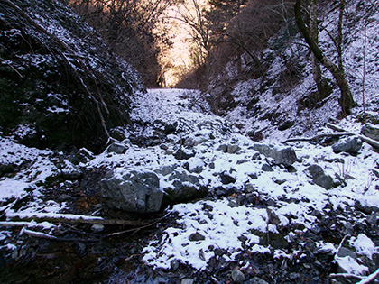 下るにつれ雪が増えてきました。かつてはしっかりした道だったみたいな道が現れ、