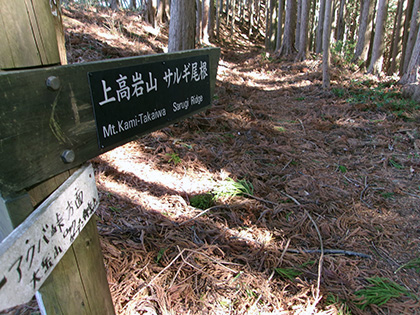 サルギ尾根のてっぺんから登ってきたルートを引き返します。上高岩山の名前を確認。