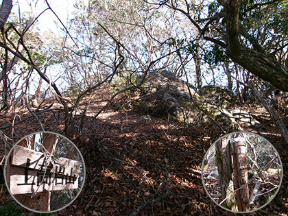 稜線に立つと目の前に道標が立っていました。これにてようやくひとつめの岩巣をクリアです。ほっと一息つけます。ここは上高岩山から尾根を下っていた破線の上です。この写真の奥は先ほど回り込んできた岩稜と負けじ劣らずの急峻で凶相な面構えをしています。破線は岩巣を巻くルートだったみたい。まっ、地形図を見るとその通りなんですが。