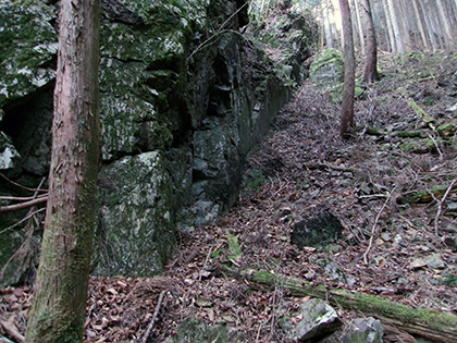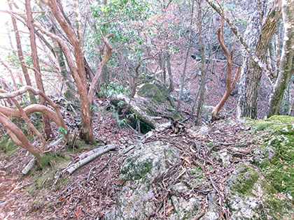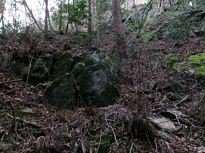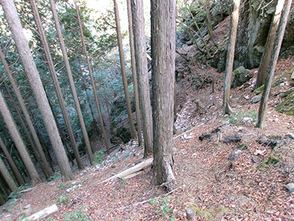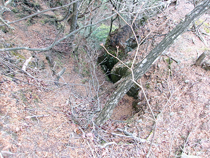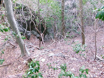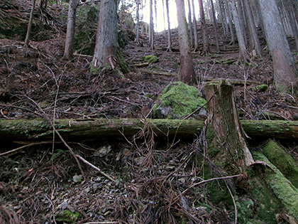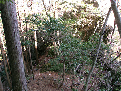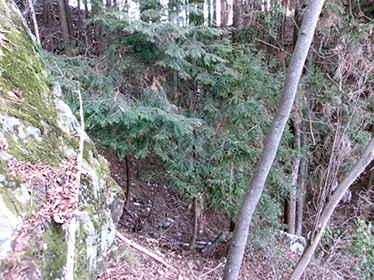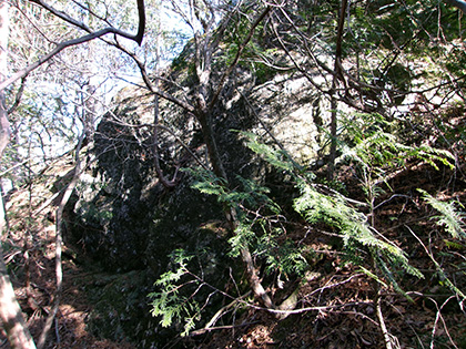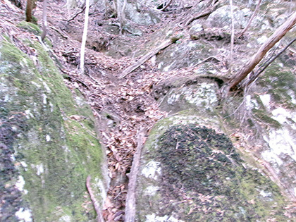 上高岩山北東尾根はサルギ尾根の上高岩山から養沢川に向かって北東に下っている尾根です。上高岩山は『奥多摩』(前出)などでは大グラミノ頭と表記されています。上高岩山北東尾根は大グラミ沢と小グラミ沢という沢に挟まれていて、前ページで書いた岩巣が地形図通りに2つありました。地形図に抜かりはありません。3つじゃなくてよかったです。