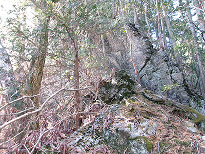 小尾根を見上げます。登るときはここから取付けそうですが、岩稜から降りられずに途方に暮れて日が暮れることになりかねません。