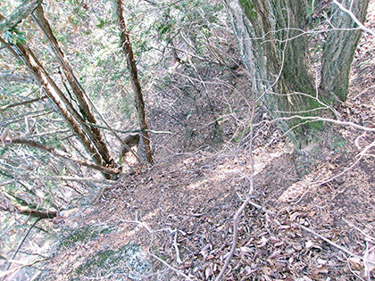 右手は穴みたいな凹みがほぼ垂直に下っています。デンジャラスどころの騒ぎではありません。