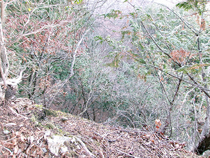 左手は激しく切れ落ちています。足元はモミかツガかなんかの落ち葉でふかふかなんですが、それがかえって腰を引かせます。