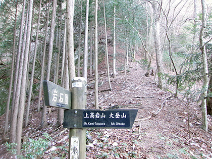 ■尾根分岐(1067m標高点)→(20分)上高岩山→上高岩山北東尾根→(2時間30分)養沢川→林道御岳線→上養沢バス停→(45分)[GOAL]大岳鍾乳洞入口バス停→JR五日市線武蔵五日市駅
