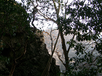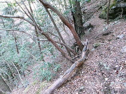 ひとつめの岩巣はデンジャラスの塊でした。切れ落ちた岩崖をほーほーの体でやっと巻き終えたと思ったら、めざす尾根とズレていて進路修正。ただトラバース(山腹水平移動)すればいい、というわけにはいかず、そうとうかなり神経だけでなく寿命をすり減らす過酷な尾根下りがつづきました。