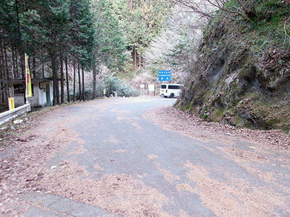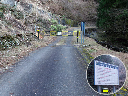 御岳林道起点のゲートを抜けます。ゲートの向こうには御岳山に向かう林道鍾乳洞沢線が山腹を登っています。