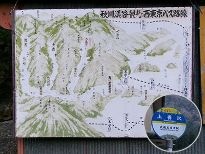 上養沢バス停のバス折返し場に着きました。しばらく見入った案内板です。尾根の位置関係がよくわかります。バスの発車まで1時間以上ありました。じーっと待っていてもしようがないのでとりあえず歩き始めます。