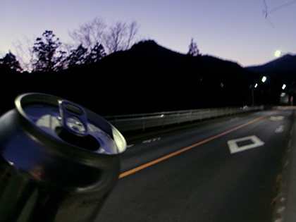 御岳林道に立ちました。臨場感ある写真ですがたんに手ブレです。これにて上高岩山北東尾根はおしまいです。ザックを降ろし、チェーンスパイクをはずし、ちょっと休憩します。あとは上養沢バス停まで車道を歩くだけです。