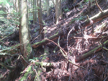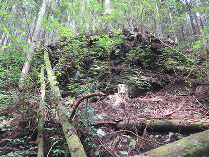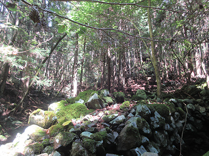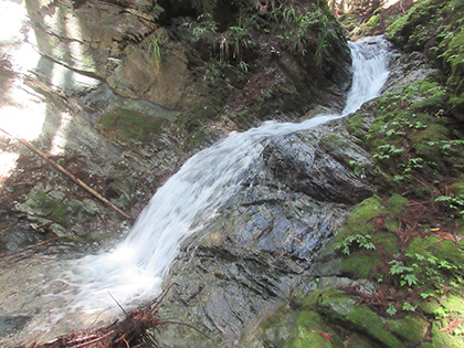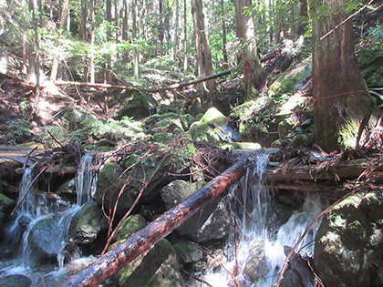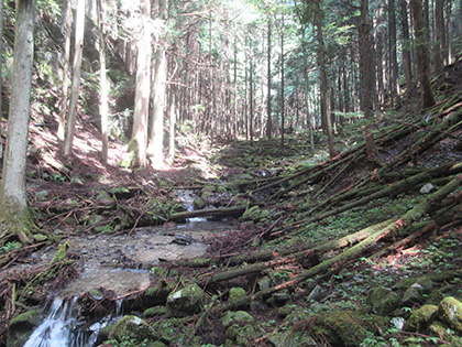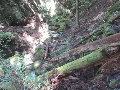 笹ヶタワノ峰南尾根へのアプローチはアッチ沢の左岸に踏み跡がありました。デンジャラスではないにしろ難儀なトラバース(山腹水平移動)があったりして尾根の取付までたどりつけるのか、不安なままひたすら上流へ上流へと歩いていったんですが、