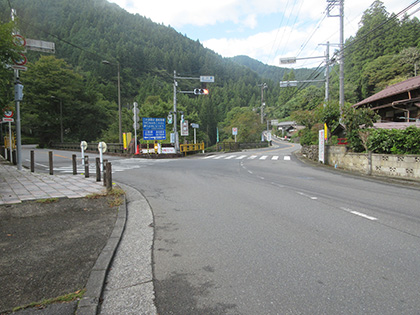さらに檜原街道を歩きます。バス停から20分ほど、南秋川へ降りるポイントとしてGoogleマップのストリートビューで目星を付けていた白い手すりの階段(写真中央やや右上)が見えてきました。