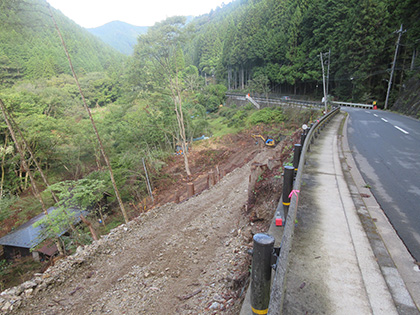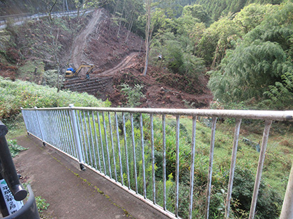 階段ではなくコンクリートの坂道でした。大規模な工事現場が見えます。朝方までの雨で坂道は滑ります。川べりの大きな建物に向かう道路をつくっているようです。