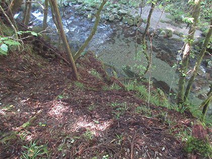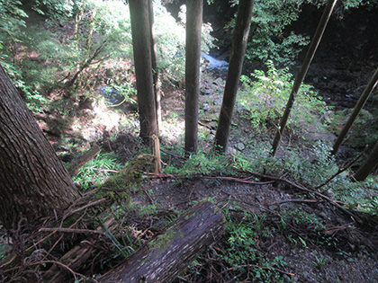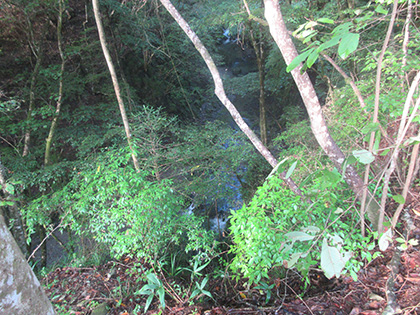 踏み跡は川沿いにつづいていますが、そこそこしっかりした踏み跡が川に向かって下っています。川沿いにちょっと先に進んでみましたが川に降りられそうな場所はなく、引き返してきました。ここを下ることにします。