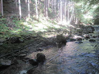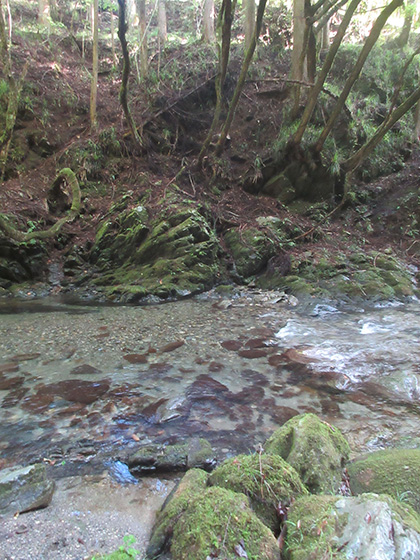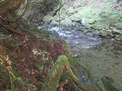 川に降りました。下流の瀬で渡れるかと思い岩をへつって下っていきましたが思いのほか水深があって断念。