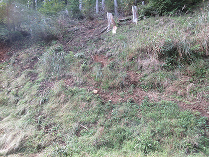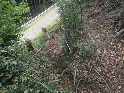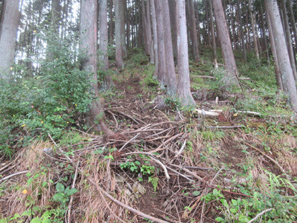 林道を右へ左へ、尾根に取付けそうな場所を探しました。左へちょっと歩いた山腹に、草を釘の頭でずずずーっと削り取ったような踏み跡を発見。取付きます。