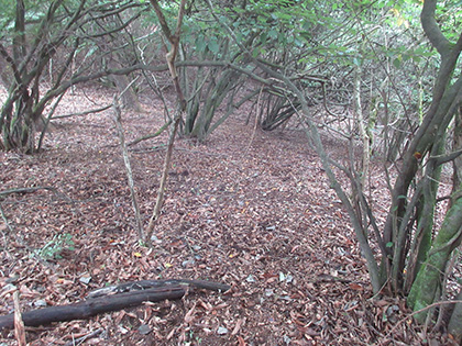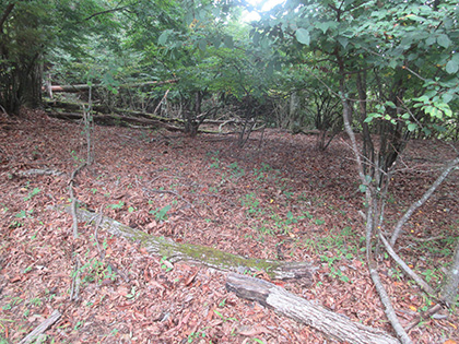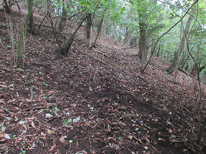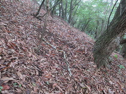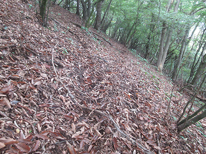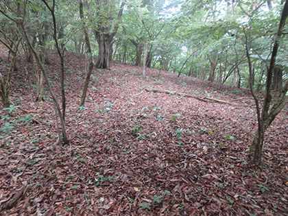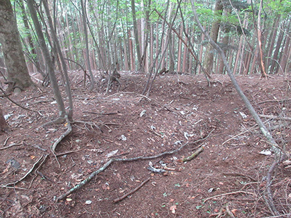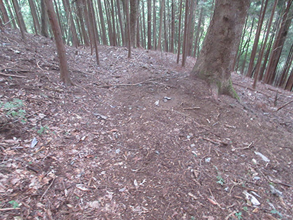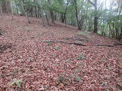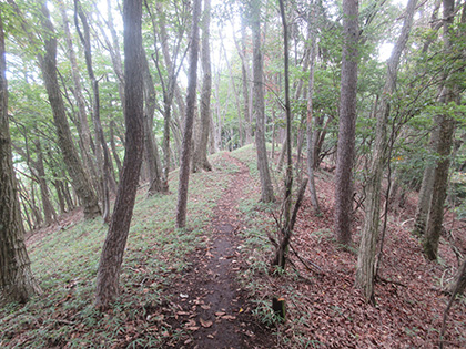 後半のハイライトは田和峠からの地形図の破線(徒歩道)歩きでした。地形図には笹尾根の北を巻いて槇寄山北東尾根に向かう破線が描かれています。けれども前回、南谷沢二俣中間尾根を探したときと同じく道は見つからず、なだらかな山腹をさまようハメに陥ってしまいました。破線は廃道というよりは消道だと思います。ただ、破線をなぞるように獣道がつづいている場所があり、ヒトが棄てた道を獣が利用しているみたい。