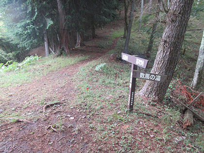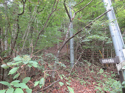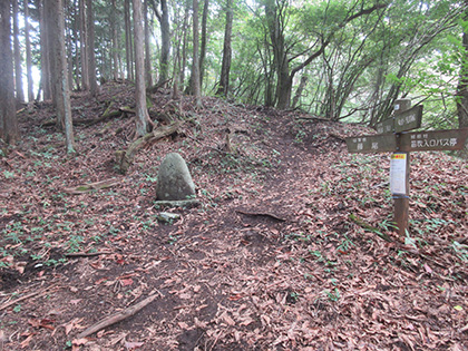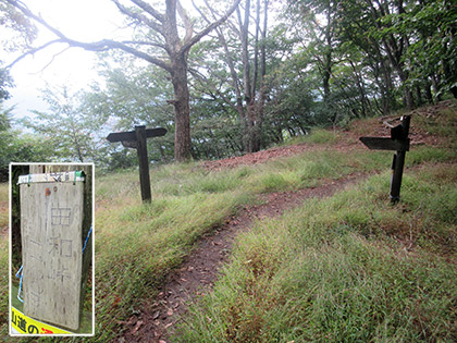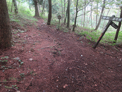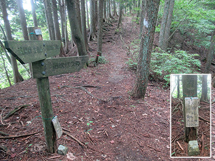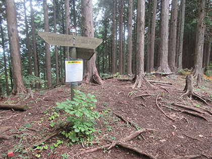 道標です。左に急降下する道には通せん坊の丸太が置かれています。道標に従って向こう側に越えると