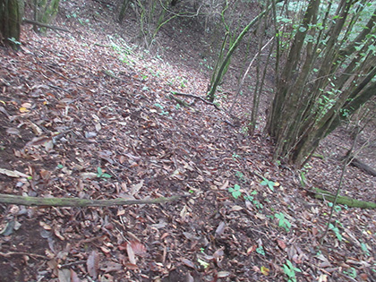 テキトーにトラバース(山腹水平移動)をつづけていたら破線から上にずれていました。道を探しながら下ります。