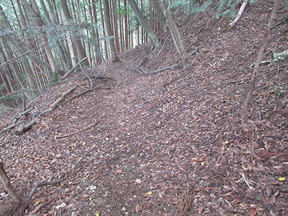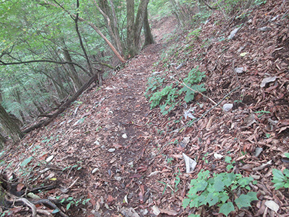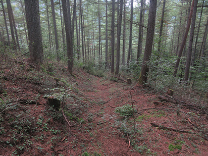 西原峠からのしっかりした道に合流しました。結局、田和峠からの破線は廃道というよりは消えてなくなった消道、とわたくしなりに結論づけました。ここからは槇寄山北東尾根を下ります。