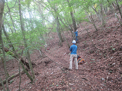 左手上から話し声が聞こえてきました。ヘルメットを被り作業着を着た3人のグループです。西原(さいはら)峠からの道を下ってきたようです。