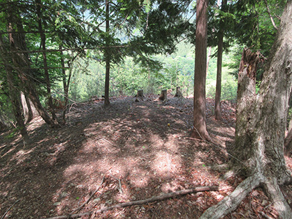 ワクギ沢左岸尾根の上部は松生山北尾根(まつばえやまきたおね)と重複しています。伐採地跡のてっぺんの分岐に立つと思わず「ふーっ」と声が出るいい景色が広がっていたりもしました。