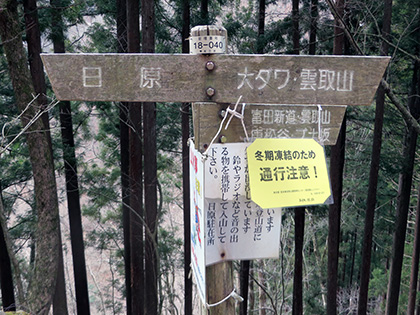 東日原バス停から歩き始めて戻るまで約8時間のコースタイムだったが、そのうち林道歩きが約3時間。ん〜、まあリハビリ山行としてはいいバランスだったかもしれない。ただ、道中の後半はひどい雪で、道を見失ったり、大スベリしたり、手痛い洗礼を受けてしまった。