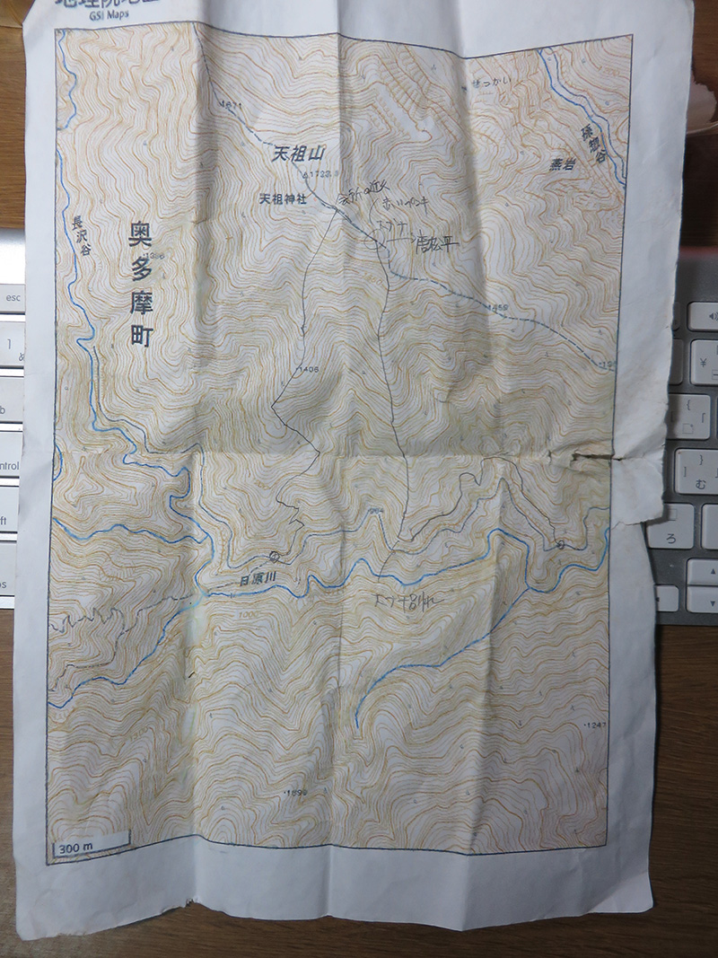 これが持参していた地形図[拡大]。鉛筆の線が歩く予定のルート。私なりの検証ですが、地形図には尾根が1本抜けてんじゃないでしょうか。