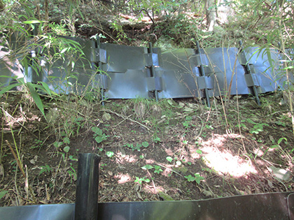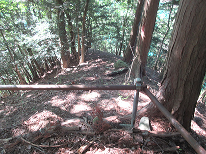 子どもカモシカと別れて雨乞山南西尾根に立ちました。尾根の部分だけに鉄パイプの柵がありました。柵を越えて下っていくと擁壁を覆う落石防護網に絡め取られてしまいます。